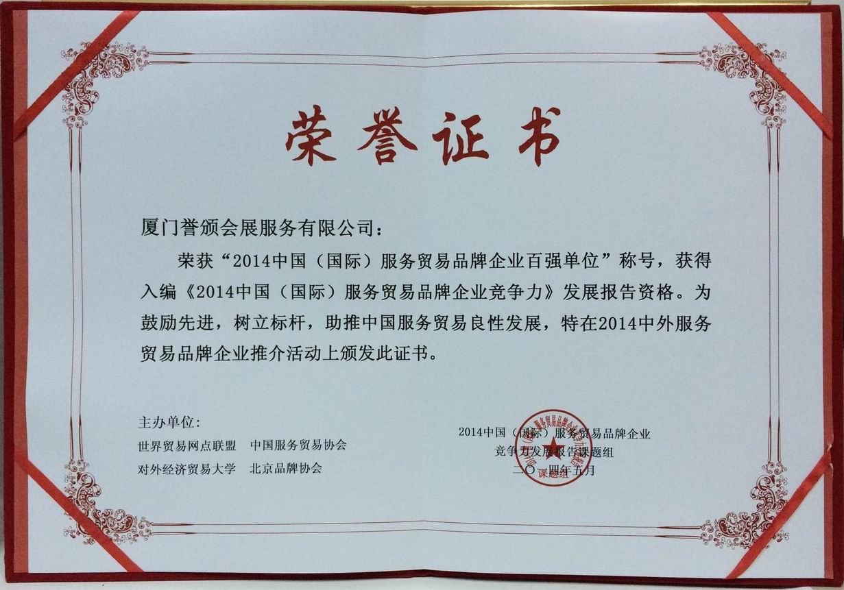 譽頒會展榮獲“2014中國(國際)服務貿(mào)易品牌企業(yè)百強單位”稱號,獲得入編《2014中國(國際)服務貿(mào)易品牌企業(yè)競爭力》發(fā)展報告資格。特在2014中外服務貿(mào)易品牌企業(yè)推薦活動上頒發(fā)榮譽證書。
